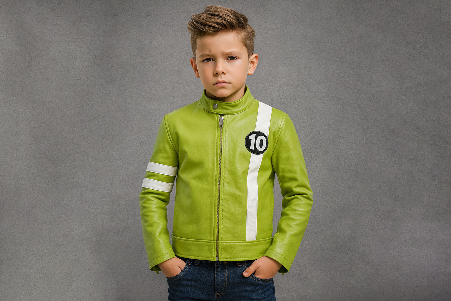 The famous Ben 10 jacket has a stand-up collar, and the logo of number 10 is placed on the left side of the jacket. The colour of the leather jacket is green and it has white colour lines falling from top to bottom with a logo placed slightly below the shoulder. The open cuff adds a royal touch of an alien fighter. The zipper closing does the last trick and makes it stand out from the rest. This jacket will instantly charm your little one, once and for all.