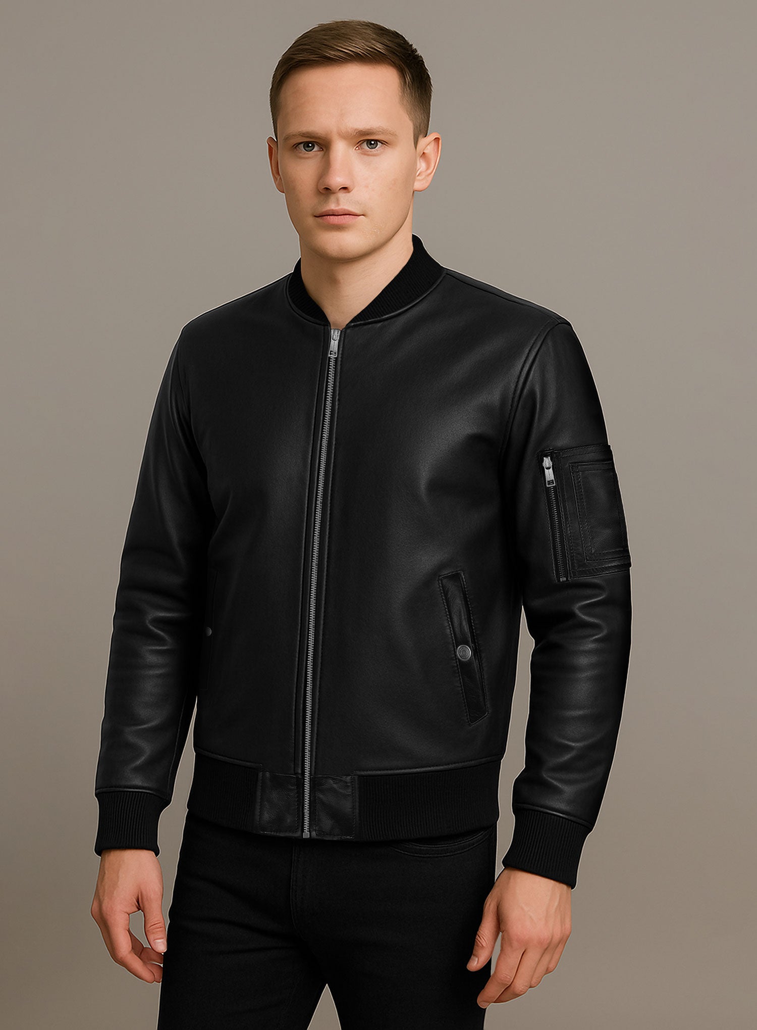 Zip into swagger with our MA-1 Bomber Leather Jacket — a modern icon crafted from smooth black leather. Featuring clean lines, ribbed trims, and an arm zip pocket for added edge, this jacket fuses military heritage with street-smart precision.