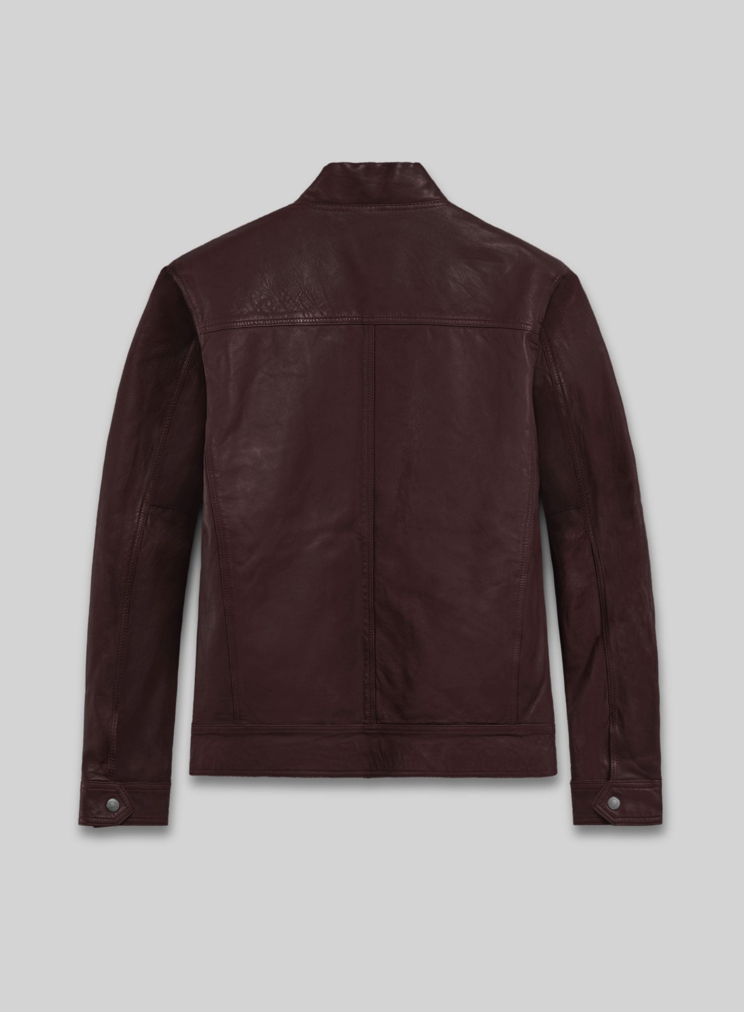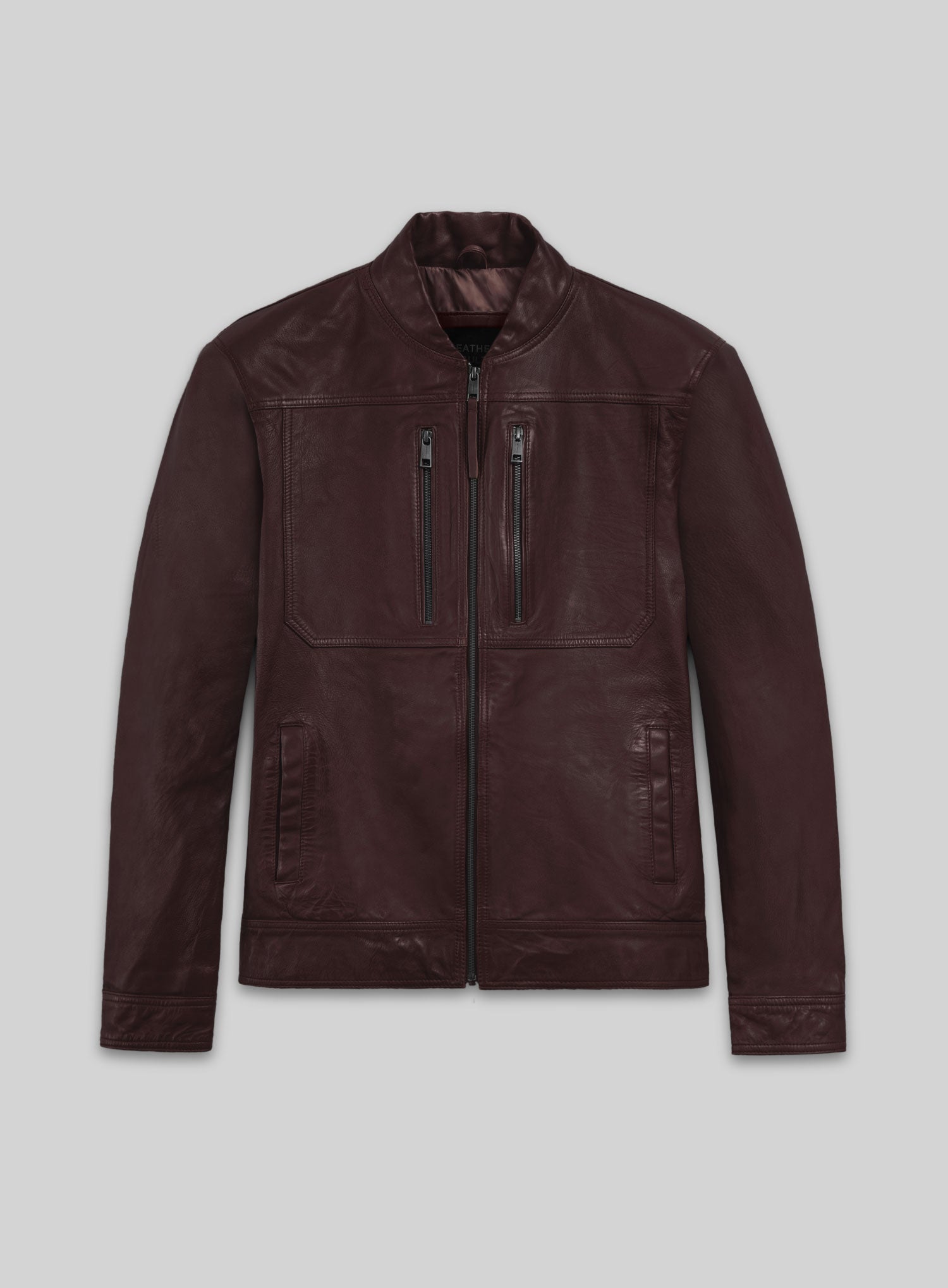 Crafted from premium leather in a deep wine shade, this jacket features a clean front zip, dual vertical zip chest pockets, and sleek side pockets. The minimalist collar and sharp tailoring bring that perfect mix of rebel and refined.