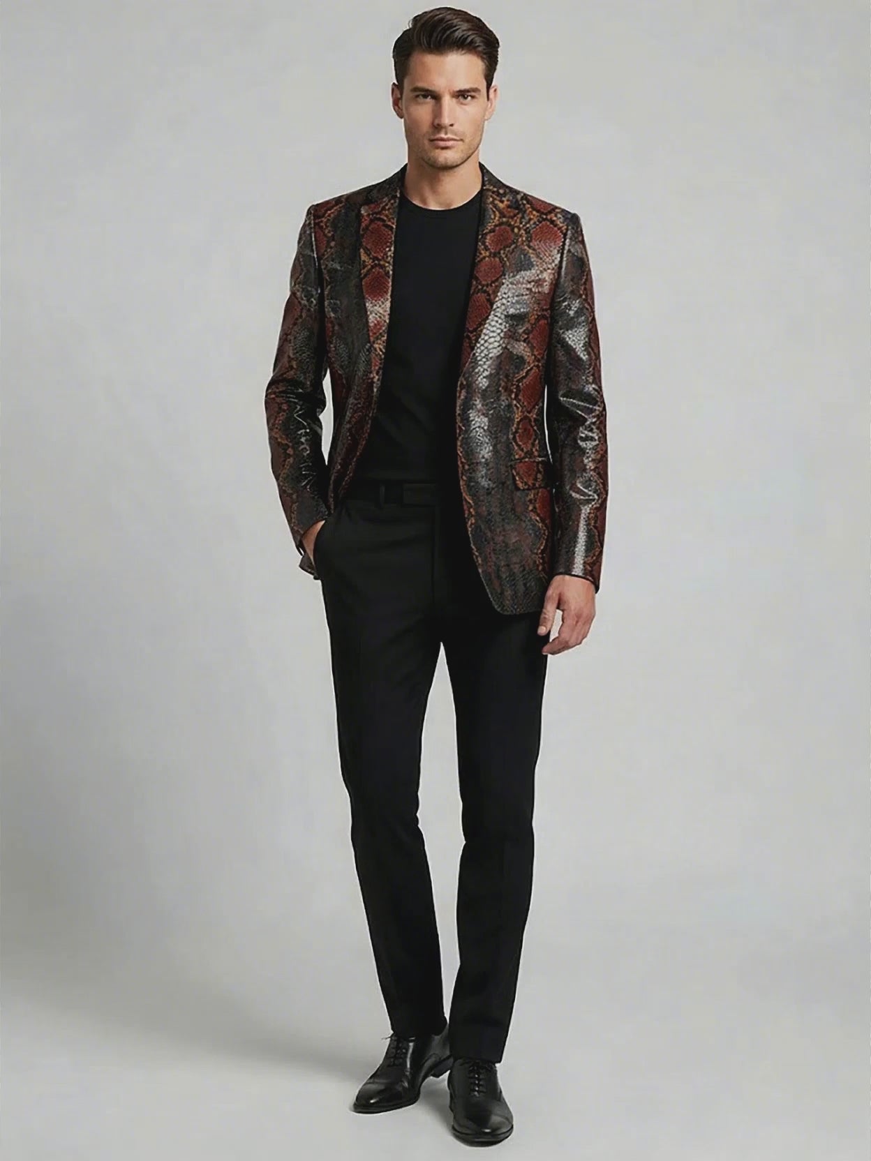 Unleash your inner renegade with the Bold Knight Python Leather Blazer - where untamed texture meets refined tailoring. Crafted from premium python-print leather in deep ember and obsidian tones. This blazer exudes fearless sophistication.