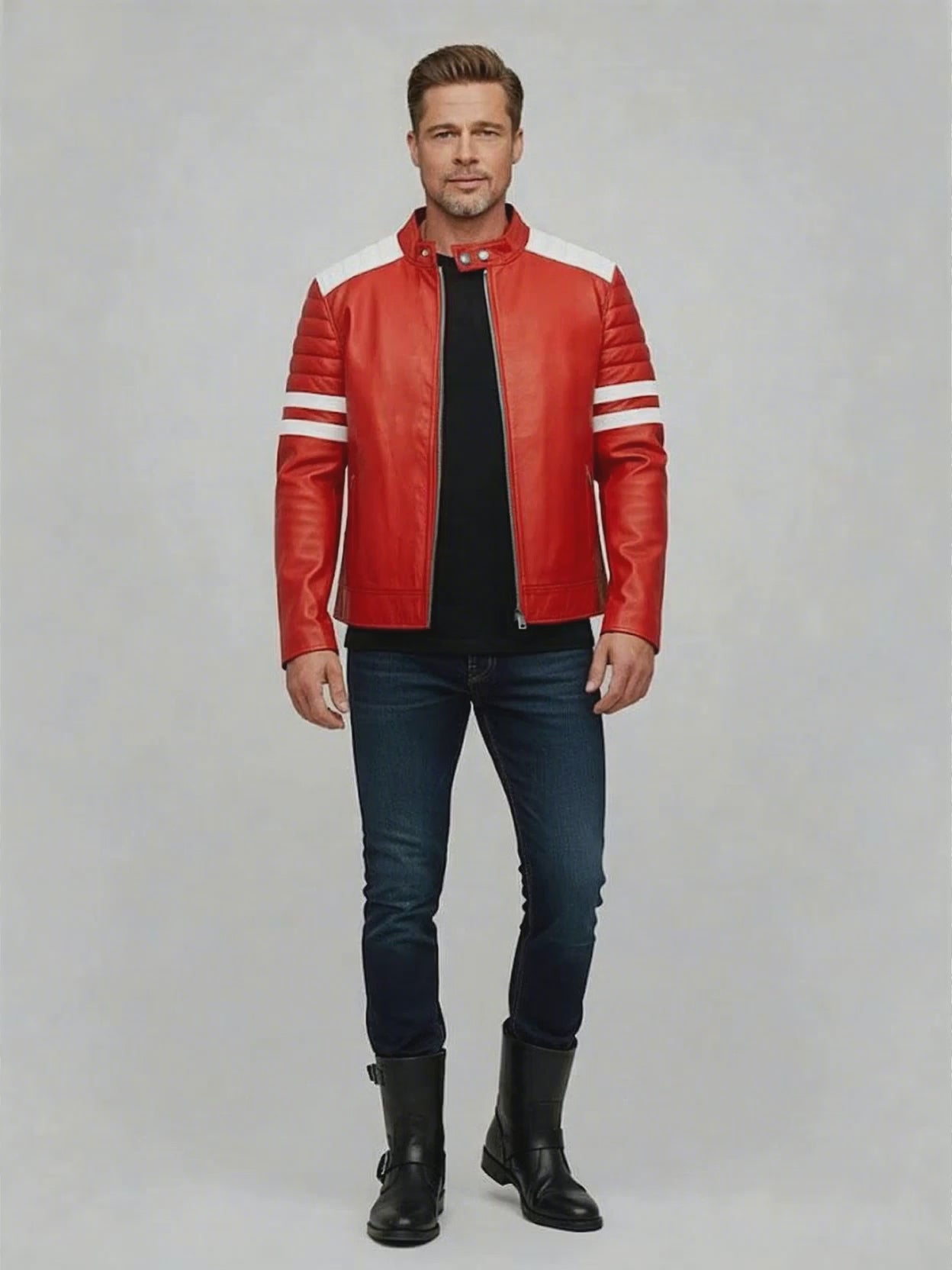 Inject chaos into your closet with our Fight Club Red Leather Jacket—an unmistakable tribute to rebellion. Crafted from premium red leather, this jacket features sharp white racing stripes on the sleeves and shoulders, quilted detailing for that retro punch, and sleek zip pockets for a touch of tactical edge. With a snap-tab collar and attitude ...