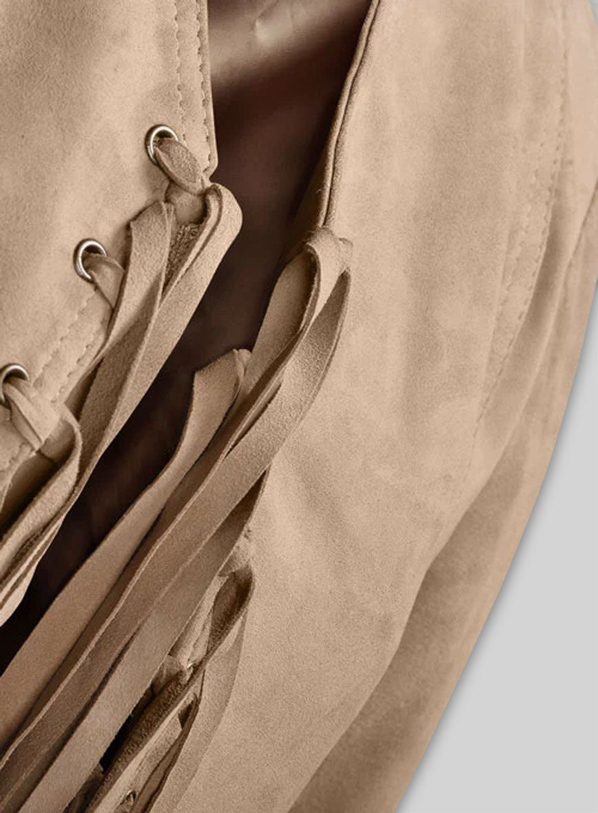 Dress up for your upcoming date night with poise by wearing our sophisticated suede leather jacket. This jacket is inspired by the character Valentina played by Francia Rasia in How I Met Your Father and features stunning fringes that add a touch of boldness to your style.