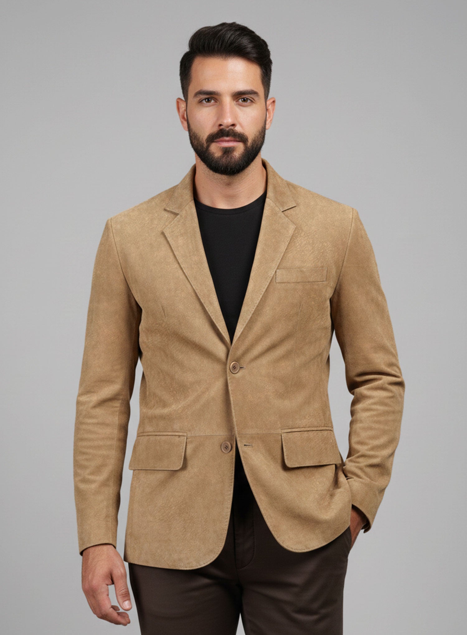 Prep up a regal solid touch with our Latte Beige Suede Leather Blazer to your look that has everyone's attention and keeps you comfortable throughout the day. Glamorize your closet and transform your aura for a charming look. Made Using Pure Napa Sheep Skin Soft Leather. Look Includes Latte Beige Suede Leather Color Two Button ...