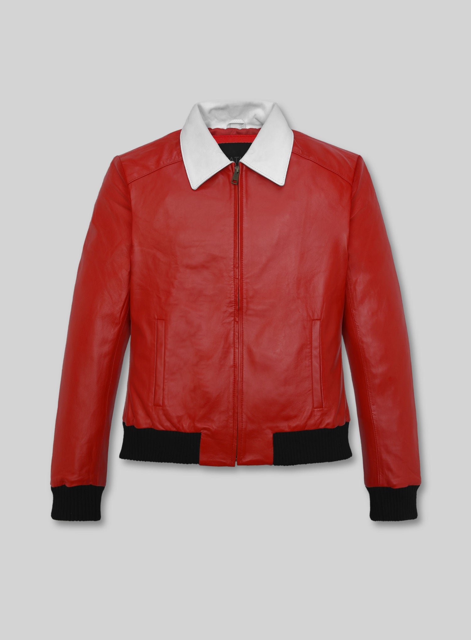 Instant icon status. This jacket blends vintage movie-star charisma with modern craftsmanship, turning heads the moment you walk in. Made from premium genuine leather in a vivid red tone, it’s accented by a sharp white collar and finished with ribbed black cuffs and hem for a tailored yet relaxed fit. The zip-front closure keeps the ...