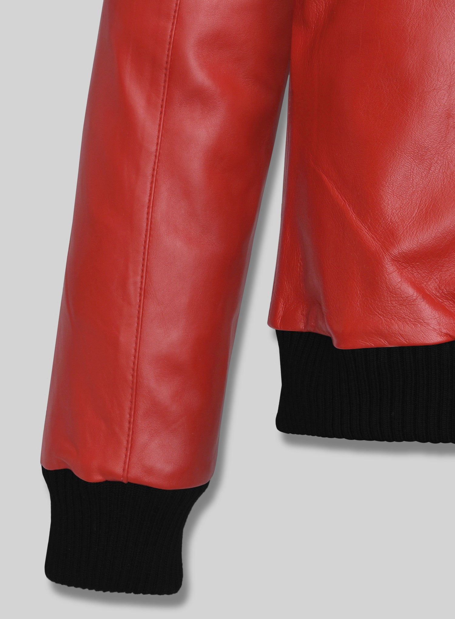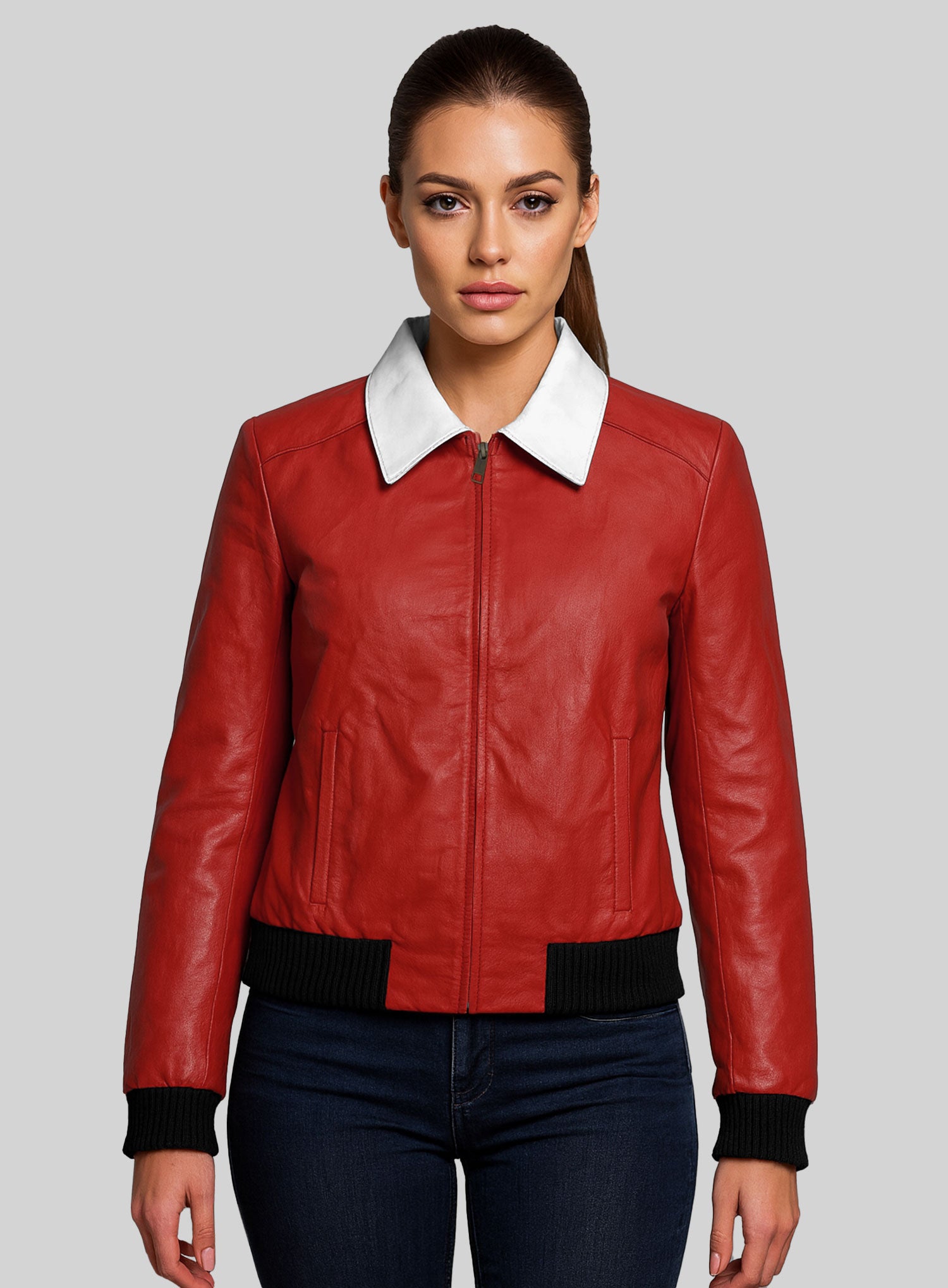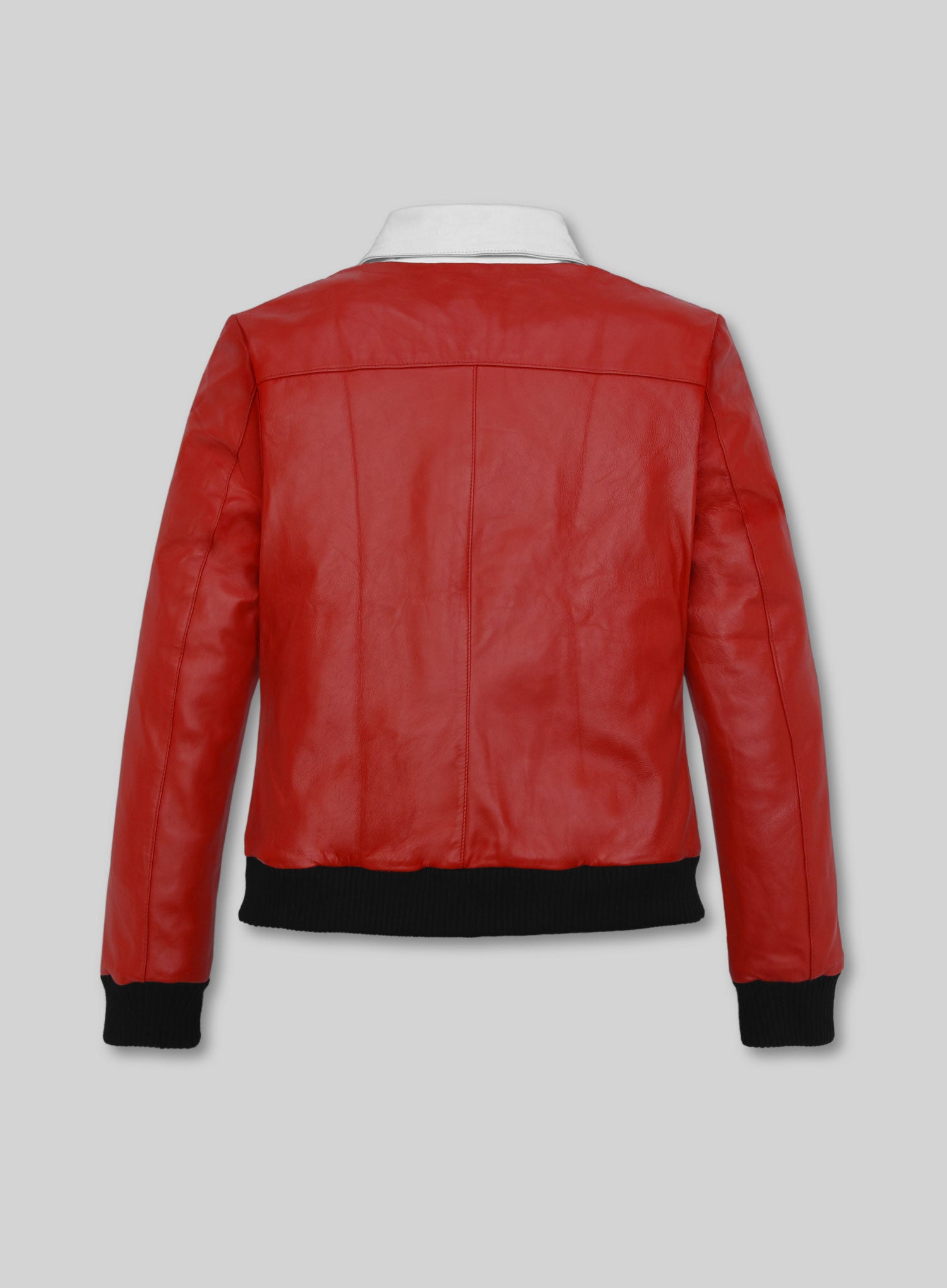 Instant icon status. This jacket blends vintage movie-star charisma with modern craftsmanship, turning heads the moment you walk in. Made from premium genuine leather in a vivid red tone, it’s accented by a sharp white collar and finished with ribbed black cuffs and hem for a tailored yet relaxed fit.