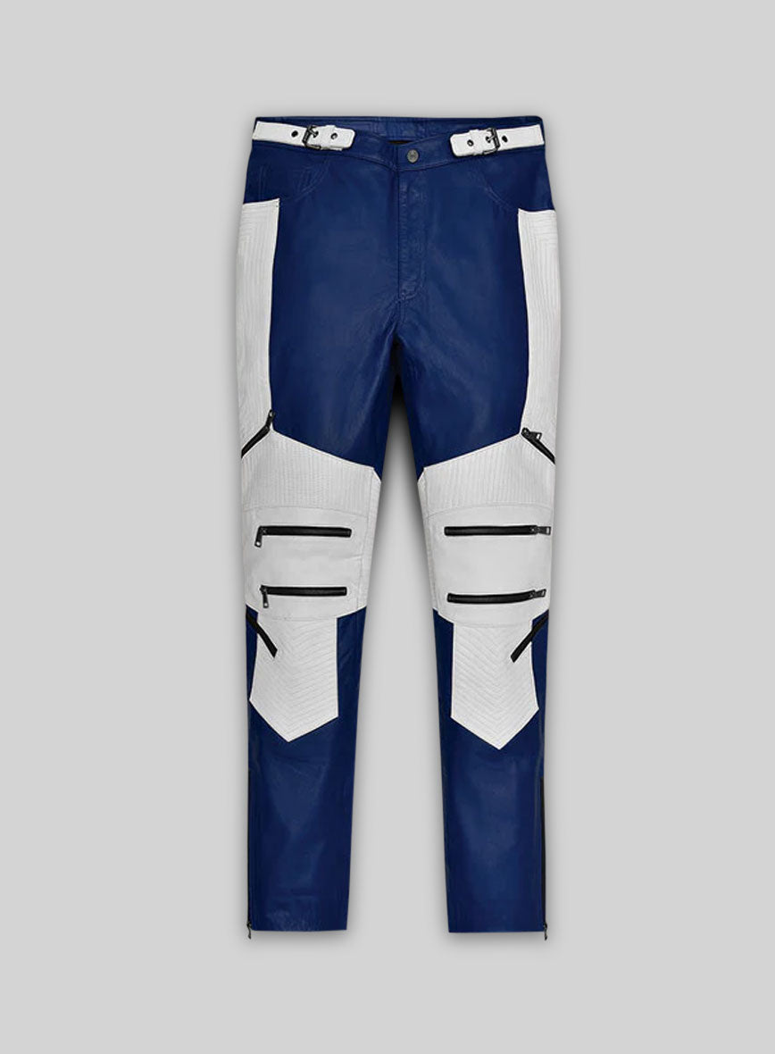 Prepare to achieve a casual yet stylish look with our one-of-a-kind leather pants.Crafted from soft and authentic PURE Napa leather, these electric zipper combination pants boast a unique blue and white dual-shaded design that ensures a distinctive appearance. Trust us, these leather pants are a must-have addition to any fashion-forward individual.