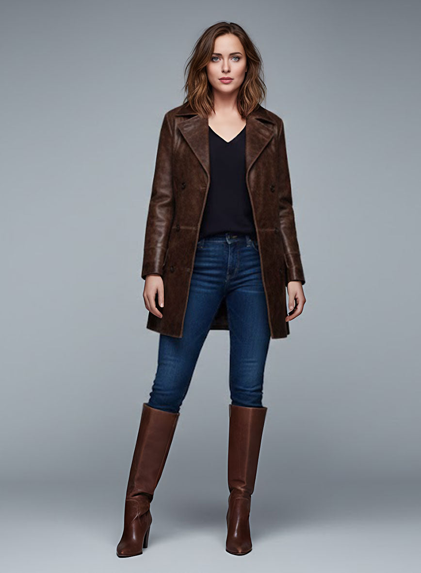 Looking for a simple yet striking outfit combination? Our Thick Dark Espresso Dakota Johnson Madame Web Leather Trench Coat delivers a powerful, versatile style inspired by her iconic look in Madame Web. Crafted from thick dark espresso leather, this trench coat creates a bold, polished appearance that transitions seamlessly from day to night, helping you take on whatever the day brings with confidence and ease.